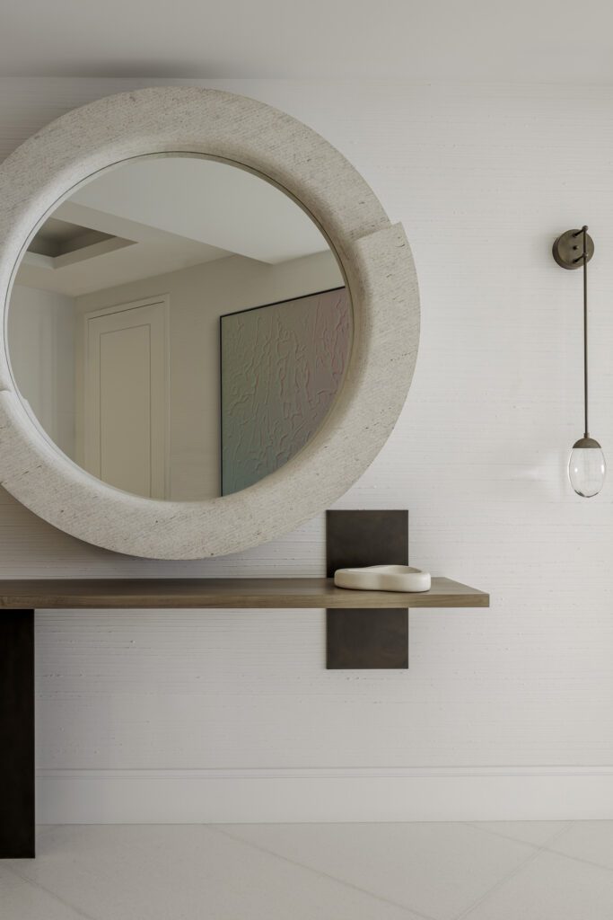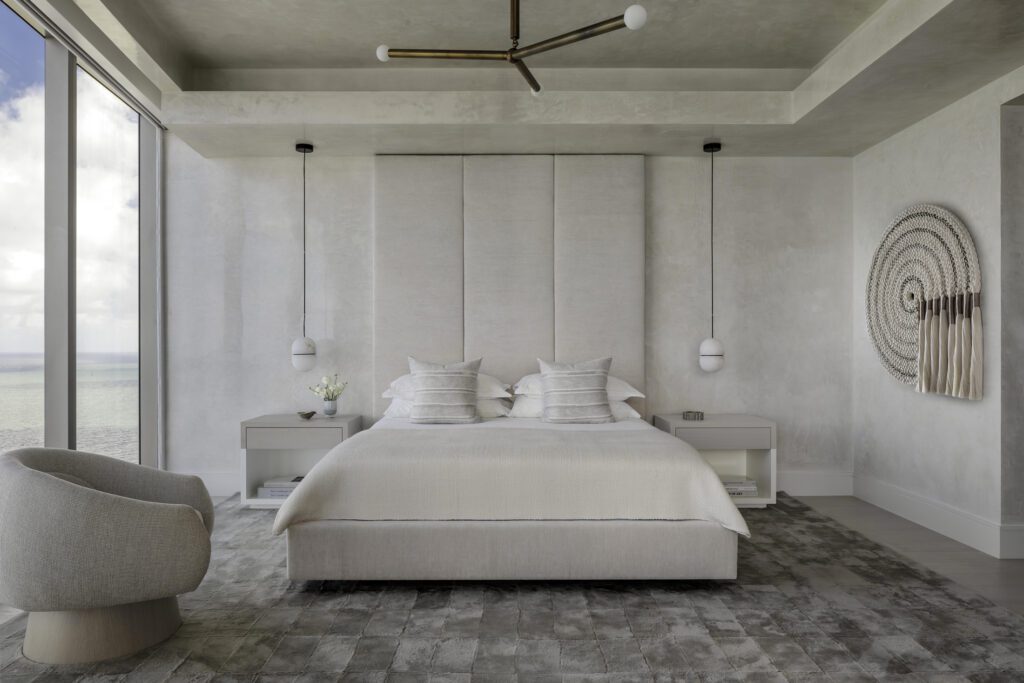 Rome describes the interiors as layered minimalism for a place, northeast Miami, that’s known for interiors that can be cold and stark. But for this couple’s home away from home, this designer turned to clean and streamlined neutral materials like stone, linen, and mohair, creating spaces that feel warm while they look out over the water.