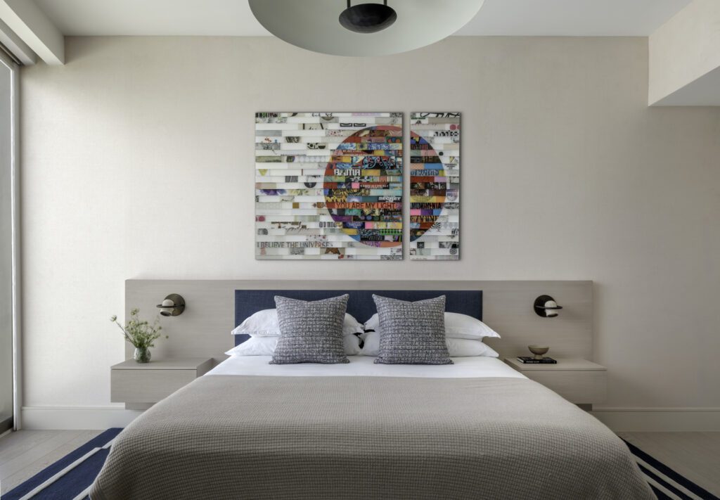 “I often design my own custom pieces, especially this bed for their primary suite, one that fits floor to ceiling very specifically,” she says. “It’s difficult to find things that fit perfectly, so I’m inclined to design furniture to scale.”