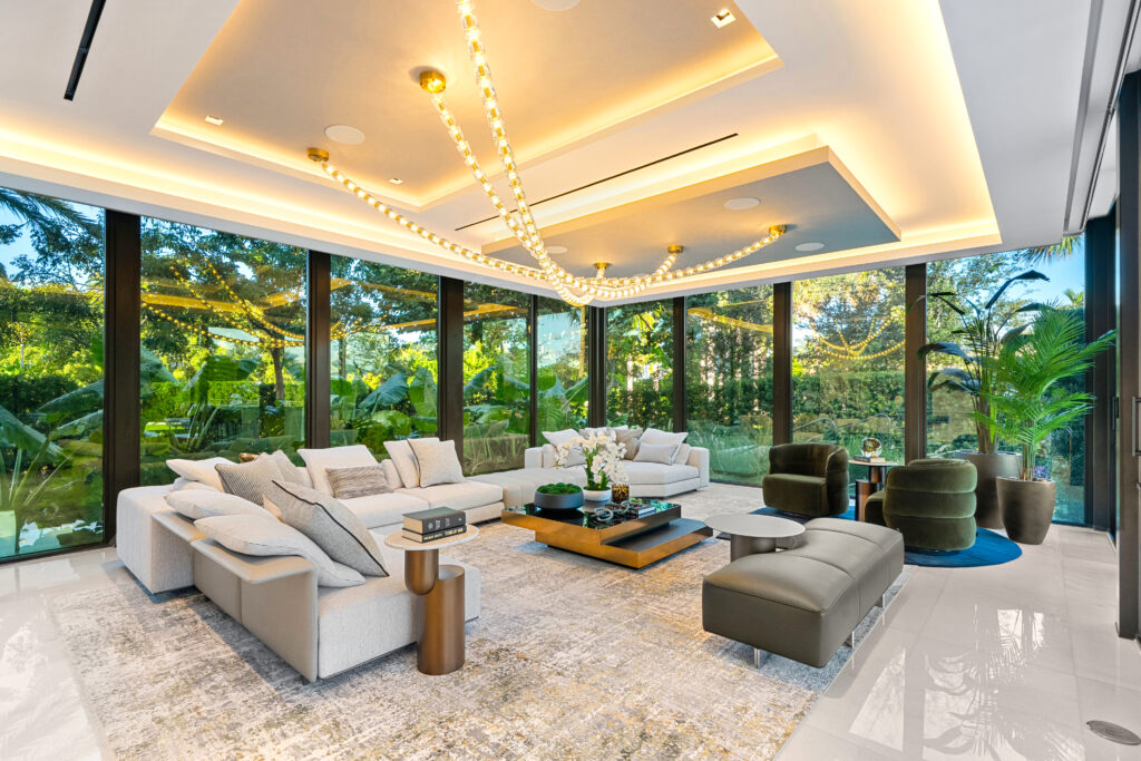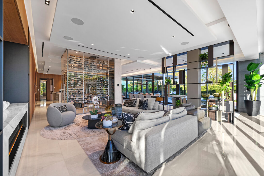 Casa Moderne is offered fully furnished with pieces from Minotti, Fendi, and other high-end design houses. The chef’s kitchen features custom wrap-around cabinetry, a 7-seat island, Wolf cooking suite, and Sub-Zero refrigeration—positioned to serve both daily living and large-scale entertaining.