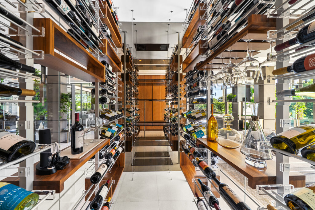 Additional amenities include a walk-in wine cellar with 500+ bottle capacity, an elevator, a second-floor morning kitchen, an air-conditioned four-car lift-ready garage, and a full Crestron smart-home system.