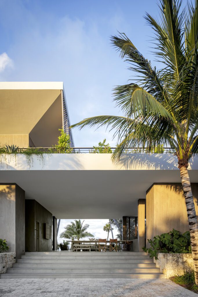 “The goal was to embrace that island vibe,” says Mangimelli. “Our client is young and vibrant and was inspired by jewelry and fashion and art. We wanted that vibrancy to show in the interiors while using organic materials, like stone, concrete, and porcelain tile, to keep things down to earth.” A trademark architectural element is the louvered screens. Crafted from ipe, they are designed to gray naturally over time. Inspired by the resident palm fronds on his very first site visit, Strang designed the angled louvers to emulate the effect of sun coming through palm fronds.